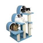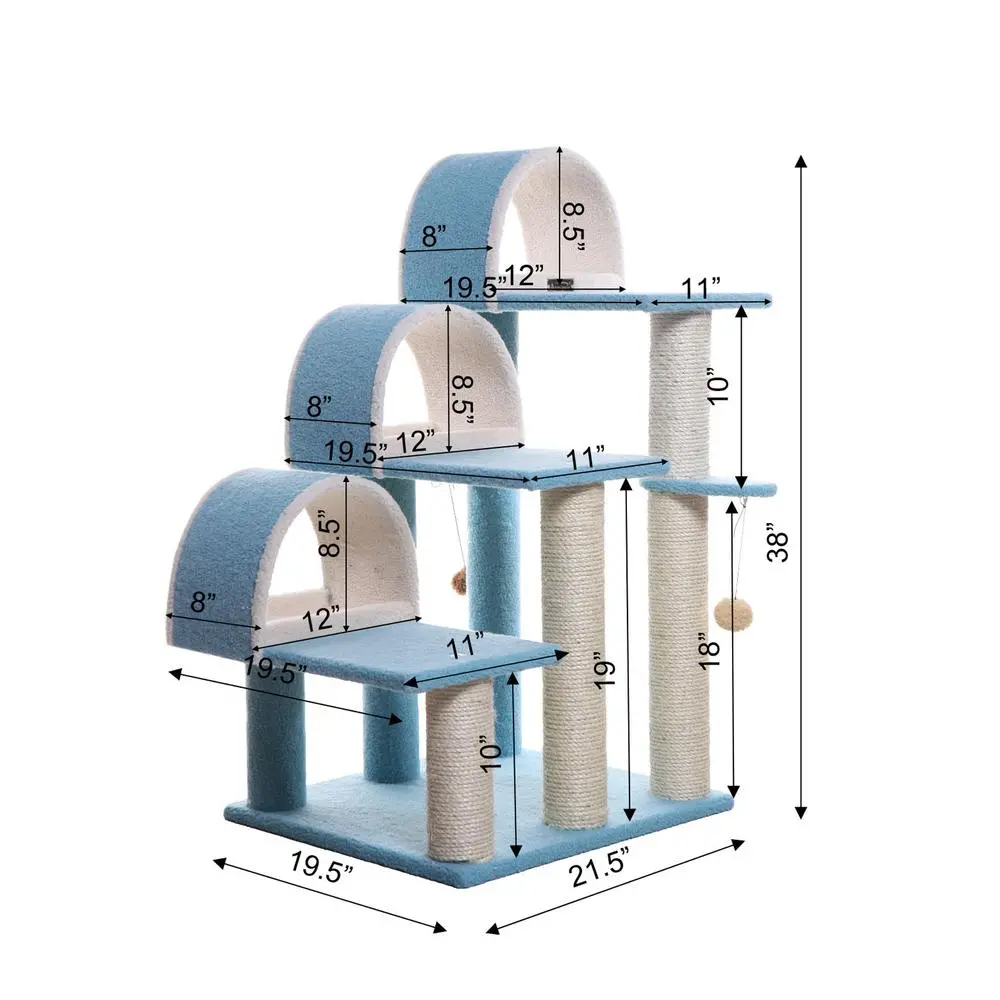 Model No.: B3803; Features: Easy to assemble with step by step instructions and tools; Scratching posts 100% cured sisal for long-lasting “scratchability”; Cover Material: Faux Fleece; Cover Color: Sky Blue ; Board Material: Pressed Wood; Post Diameter (cm): 9; Overall Dimensions (cm): 79(L) x 51(W) x 97(H) ; Base Dimensions (cm): 60 x 50; Playhouse Dimensions (cm): 30.5(L) x 20(W) x 25.5(H); Perch Dimensions (cm): N/A ; Max Holding Weight: 14 kgs;
