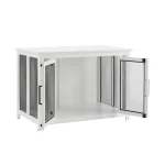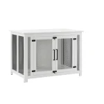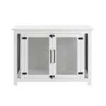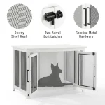 Modern design Two classic barrel bolt latches and sturdy steel black mesh on the dog kennel Double doors provide room for entry and exit, one door can be locked in place to create a smaller opening Can fit pet beds up to 30″W x 20″D Designed for small to medium-sized pets Only recommended for well-behaved, crate-trained pets – not ideal for passionate chewers, escape artists, or accident-prone animals Pairs well with modern farmhouse decor Credenza top weight limit is 100lbs